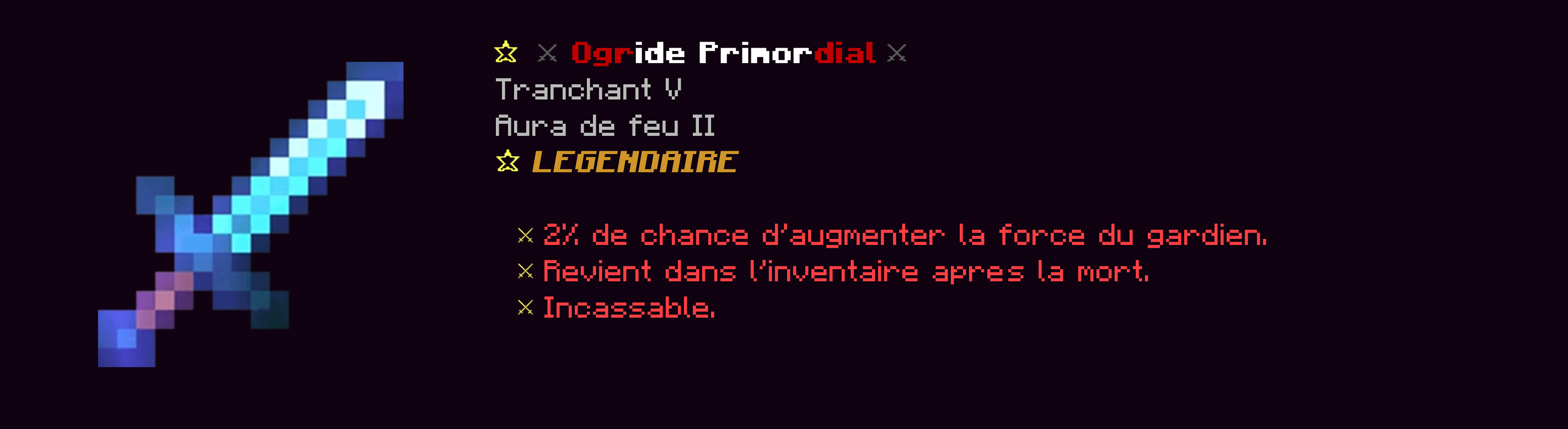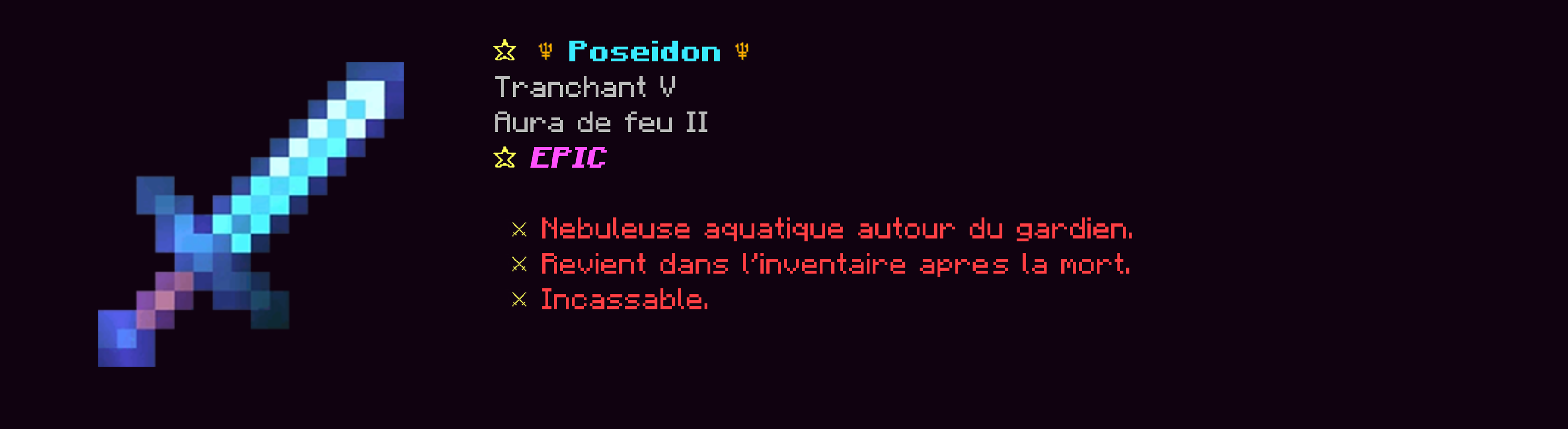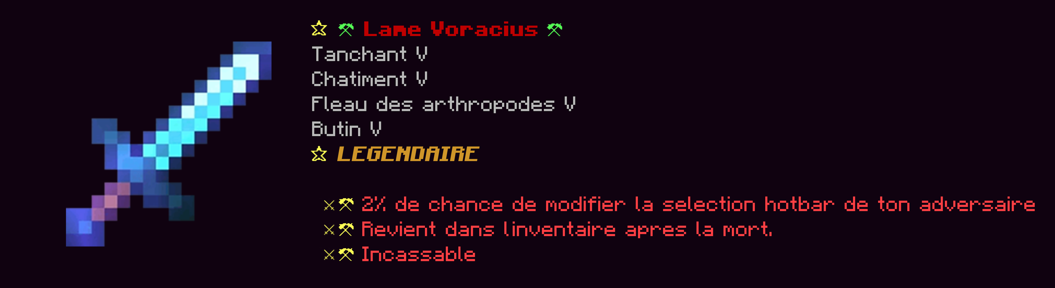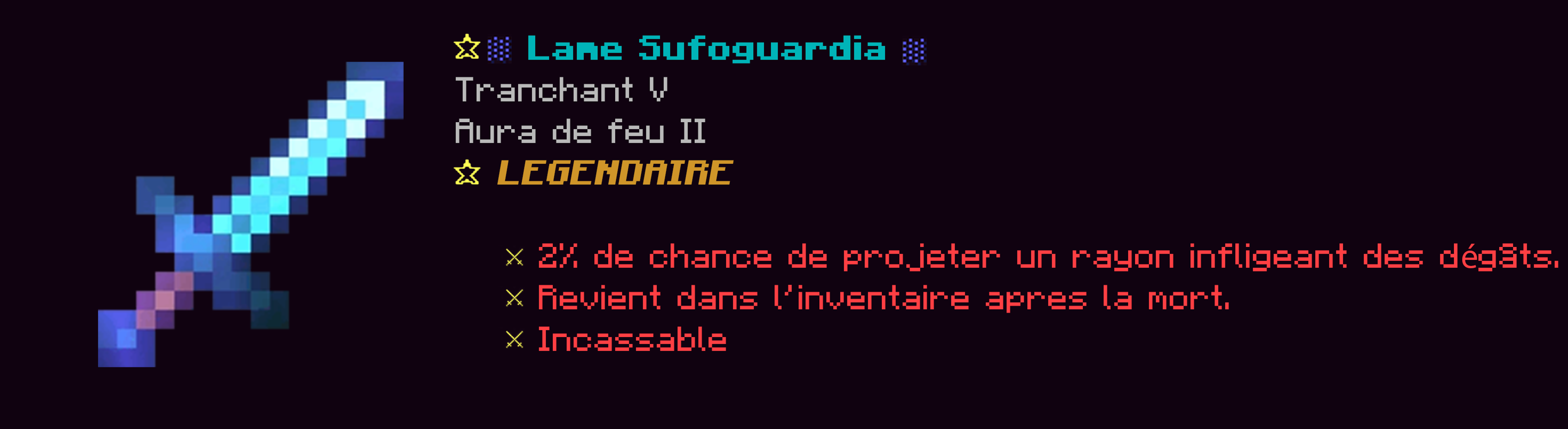 Les objets **Légendaire** et **Épic** sont protégés. Ils **ne peuvent pas être jetés**, **sont incassables**, et **réapparaissent automatiquement dans l’inventaire** en cas de mort. Un système de sécurité empêche également de **les supprimer accidentellement**, garantissant leur **conservation permanente**.