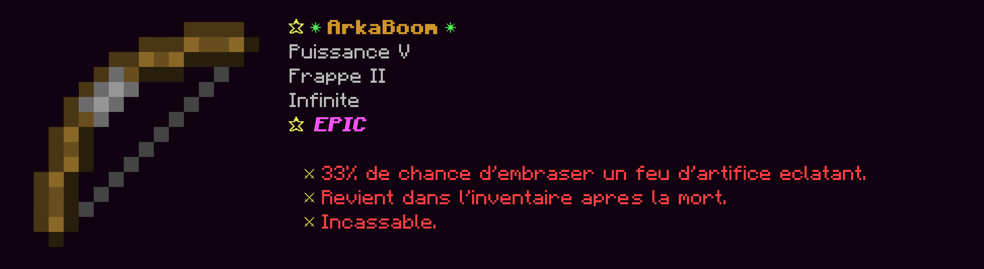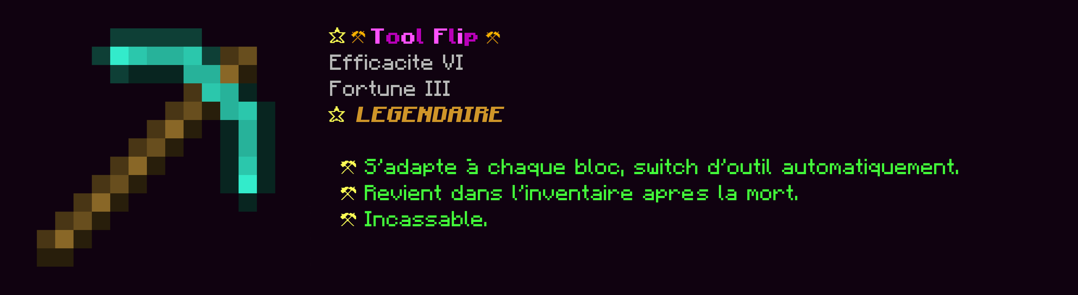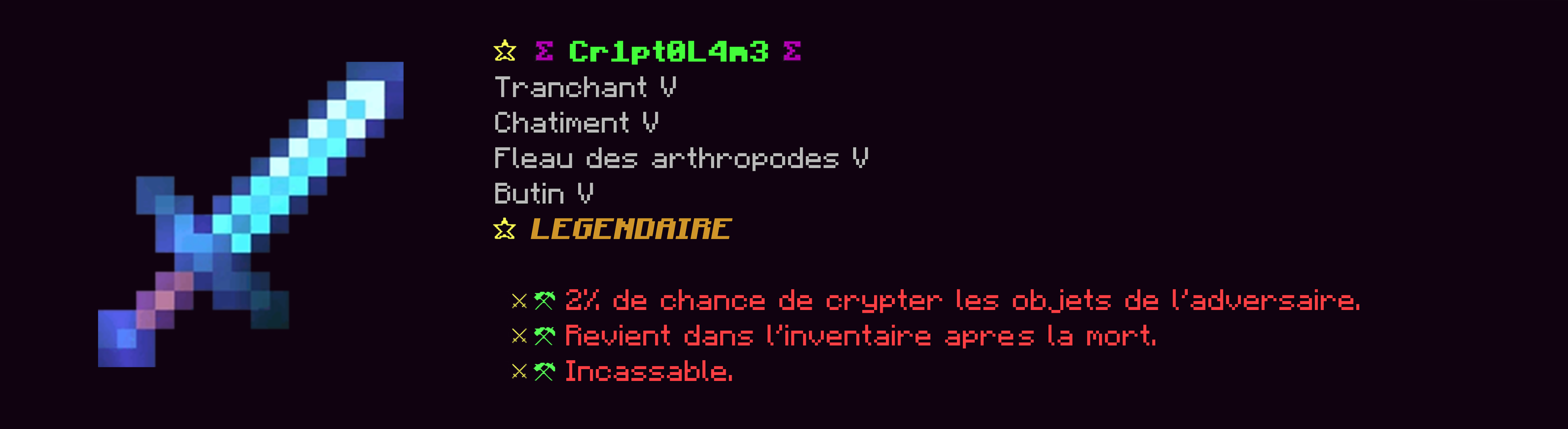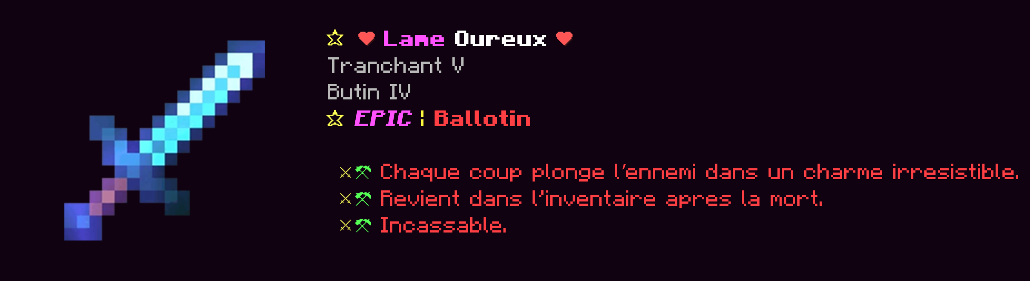 Les objets **Légendaire** et **Épic** sont protégés. Ils **ne peuvent pas être jetés**, **sont incassables**, et **réapparaissent automatiquement dans l’inventaire** en cas de mort. Un système de sécurité empêche également de **les supprimer accidentellement**, garantissant leur **conservation permanente**.